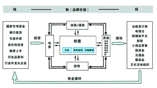 如圖1,動漫產業鏈的循環無非就是從錢到物再到錢的過程。我國動漫產業尚處于起步階段,對于大多數中小型動漫企業來說,實現資金循環并不是一件容易的事。因此,從源頭到衍生產品都不能局限于動漫產業本身,要打開眼界,尋求多方發展。而在這些市場行為背后,動漫品牌價值是最值得投入,也是最為重要的環節。