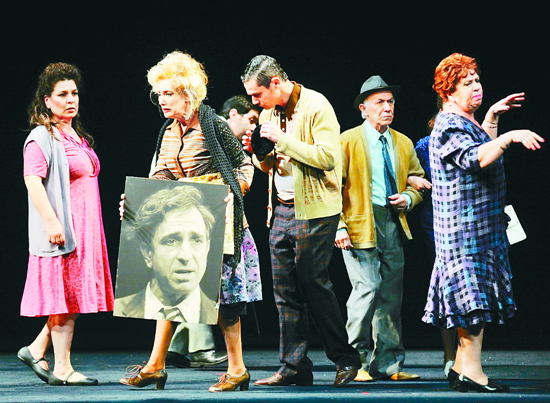 首先與京城觀眾見面的是《手提箱包裝工》(又譯《旅人》),首演于1983年,被認為是哈諾奇·列文早期喜劇的代表作,此次來京上演的是該團2011年的復排版本。或許是出于對原版的敬意,復排導演烏迪·本·摩西在舞美上幾乎沿用了與原版同樣的布景道具及舞臺調度:空曠的舞臺,反復交叉的人群,可移動的小陽臺……相比《安魂曲》一望無垠、直通天際的斜坡,由演員扮演的充滿想象力的木屋、老樹、孤雁和瘦馬,充滿宗教元素吟詠的音樂,《手提箱包裝工》雖然也聚焦了小人物的平凡生活卻在舞臺呈現手法上略顯平淡。劇中共有20位演員參演,但群戲卻少之又少,只是在展現8場短促的葬禮時沿臺口呈剪影狀排列,其余均為2至4人的對手戲,且鮮有神來之筆。倒是貫穿全劇卻沒有一句臺詞的老祖母伯芭令人眼前一亮,她抱著沉重的行李箱、挪著小碎步、背著兒子從養老院逃回家的一幕幕,令人看后忍不住心酸。