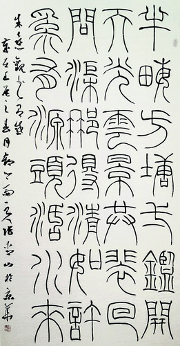 綜合來看,張青山書法成績(jī)首先在隸書的創(chuàng)作上,早期取法禮器和張遷,他把禮器的俊逸和張遷的質(zhì)樸進(jìn)行了很好的嫁接,還汲取了清代隸書的結(jié)字方法。早期隸書風(fēng)格的形成,和我們傳統(tǒng)的靠漸悟不一樣,它屬于頓悟,在短期內(nèi)實(shí)現(xiàn)突破,創(chuàng)作出屬于自己的藝術(shù)圖式。這種對(duì)書法造型的駕馭能力,也反映在他的篆書創(chuàng)作上。他的楚篆,融合了虢季子白盤和小篆的某些造型特點(diǎn),并借鑒簡(jiǎn)帛書和清代篆書的某些筆意。使他很輕松地利用金文的凝重、小篆的莊重和簡(jiǎn)帛書的書寫性實(shí)現(xiàn)了風(fēng)格的自我轉(zhuǎn)化。這種轉(zhuǎn)化含蓄自然,使我們幾乎看不出任何造作和生硬,也就是說,他的創(chuàng)作在實(shí)現(xiàn)了陌生化的同時(shí)依然不乏親和力,這種親和力正是他對(duì)傳統(tǒng)的維系。近幾年隨著對(duì)書法理解的深入,張青山又進(jìn)入一個(gè)新的層面,他的創(chuàng)作從原來的動(dòng)態(tài)化處理逐漸趨向于簡(jiǎn)靜,從外在的表現(xiàn)回到對(duì)本質(zhì)的追問,這是成熟的表現(xiàn),更是書法的必由階段。從表象到本質(zhì)的深化,不但是文的沉潛,更是人的沉潛,這種變化可以從他個(gè)體書作中得以窺見。