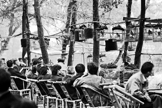 在四川,茶鋪是人們生活割舍不開的重要部分,茶鋪可以作為“客廳或休息室”,當(dāng)然也可以派生出許許多多其它用場。比如民國時(shí)期,成都有些茶鋪就成為了行幫社團(tuán)或袍哥組織的聚會(huì)之所,這類茶鋪又被稱作“行業(yè)茶鋪”。如“安樂寺茶館是糧油業(yè)的;下東大街的閑居茶館是紗布業(yè)的;上東大街的‘留芳’、城守東大街的‘掬春樓’、春熙南段的‘清和茶樓’是絲綢緞業(yè)的;安樂寺對面新商場茶社、春熙東段江樓茶社、大科甲巷‘觀瀾閣’是印刷業(yè)的;提督街‘魏家祠茶社’是皮鞋業(yè)的;商業(yè)場的‘品香’是槍支鴉片的交易市場;督院街口的茶館是全城武師會(huì)聚之處;還有的茶館是同鄉(xiāng)會(huì)、同學(xué)會(huì)的會(huì)址,像中山公園(今文化宮)的茶館內(nèi)就掛著富順縣旅省同鄉(xiāng)會(huì)、屏山縣旅省同鄉(xiāng)會(huì)等幾十個(gè)會(huì)牌。”(《民國時(shí)期的老成都》王澤華、王鶴著)這一傳統(tǒng)延續(xù)至今,當(dāng)你看見茶鋪門前懸掛的“XX川劇玩友協(xié)會(huì)”、“XX街道老年協(xié)會(huì)”或“XX信鴿協(xié)會(huì)”等牌子時(shí)便不會(huì)感覺奇怪了。再如成都新開街“蘭園茶社”,雖不完全是從事蘭草買賣的場所,因地處花鳥集市,茶社中匯聚著不少生意人,他們干脆將其作為了與買主周旋的“戰(zhàn)場”。賣花鳥的和買花鳥的,各自泡上一碗茶,理理性性地討價(jià)還價(jià),做到休閑與買賣兩不誤。正是茶鋪這種特有的人性化氛圍,使生意少了一些商戰(zhàn)中的硝煙與殘酷,多了一點(diǎn)兒世故人情味。我還記得當(dāng)時(shí)有一幫“鳥串串”(專以倒買倒賣鳥兒為業(yè)的人),為首的三十歲出頭,經(jīng)常穿一件己經(jīng)很陳舊的黑色皮夾克,帶領(lǐng)五六名二十歲左右的小跟班以“蘭園”為據(jù)點(diǎn)做畫眉、鸚鵡等生意。平日無事時(shí),大家圍坐在茶桌前打撲克賭一些小錢混時(shí)間,見有買主來,“皮夾克”一遞眼色,跟班們便蜂擁而上,有的手上提鳥籠充作賣鳥人,有的假扮顧客在買主跟前爭著與賣鳥人講價(jià),還有的裝作互不相識的圍觀者在一旁哄抬行市、推波助瀾,好似唱一出大戲,其目的當(dāng)然是為了激將買主的興趣而促成生意,千方百計(jì)將買主口袋里的錢鼓搗出來。