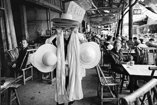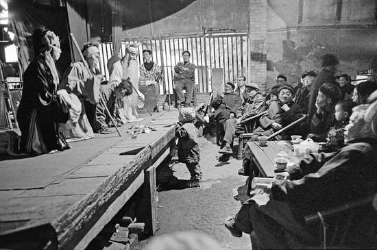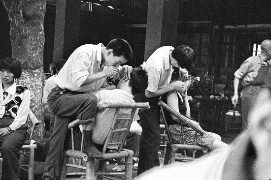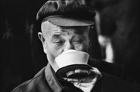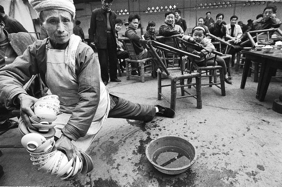 多年前回灌縣(今四川省的都江堰市)老家,跟隨素有坐茶鋪癮癖的幺外公喝過一次早茶。雄雞剛一打鳴,幺外公便喚醒了酣睡中的我,來到距家僅百米開外的一座臨街茶鋪。天色尚黑,街燈昏黃,行人稀疏,但茶鋪里卻已是沸沸揚(yáng)揚(yáng)——喊堂的,問早的,茶船茶蓋稀里嘩啦的,渾然一片,仿佛全城人一天的生活從這里熱熱鬧鬧開始了。茶客之間一陣?yán)械暮阎螅弁夤珤恕皝児挪蛔儭睂儆谧约旱囊巫幼聛恚ɡ喜杩投加辛斯潭ǖ淖唬萆仙w碗茶,在東方既白的清晨,他那一動(dòng)不動(dòng)的身影就像是一尊朦朧的雕像。幺外公向來少言寡語,常常會(huì)這樣靜靜地、心如止水般,在茶鋪里坐上一整天,有時(shí)甚至連飯都忘記回家吃。此刻,從他沉迷的眼神中,我分明感覺到平日間少有顯現(xiàn)、只有坐茶鋪才流露無遺的對現(xiàn)實(shí)人生極大的滿足。這次喝早茶的經(jīng)歷讓我對茶鋪產(chǎn)生了濃厚的興趣,長時(shí)間地估摸著:是什么原因讓幺外公如此迷戀茶鋪?從那以后,茶館里的那種特有的氛圍也隨著茶香在我心中氤氳,我也有了幺外公般的迷戀,茶館和茶客們的百態(tài)也成了我鏡頭中的一個(gè)主題。