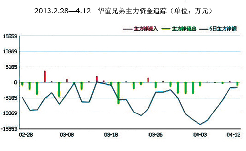 4月7日,華誼兄弟投資發行的影片《西游·降魔篇》放映完美收官,57天共攬獲12.45億元,創下多項華語電影票房新紀錄。但是,這并沒提振股市信心。從2013年2月28日至4月12日華誼兄弟資金數據表中可以看出,主力資金凈流出的總額遠遠超過凈流入。4月19日,華誼擬公布2012年財務季報,預計2013年1月1日到3月31日公司業績為:凈利潤14,085.39萬元至14,947.76萬元。
