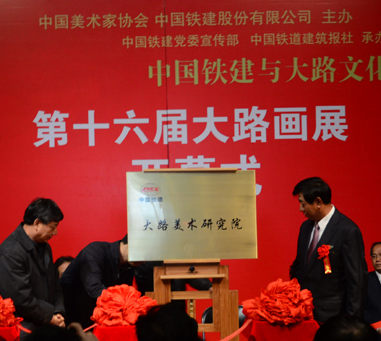 中國美術家協會分黨組書記、駐會副主席吳長江與中國鐵建股份有限公司董事長、黨委書記孟鳳朝一起為中國鐵建大路美術研究院揭牌