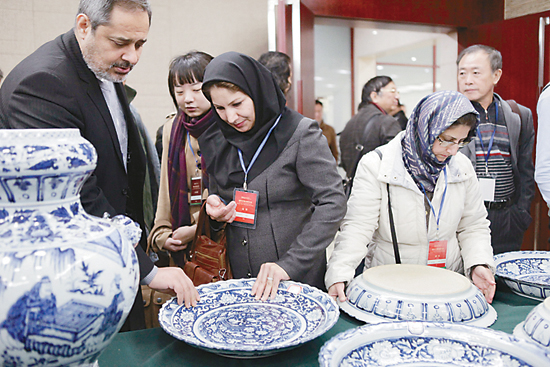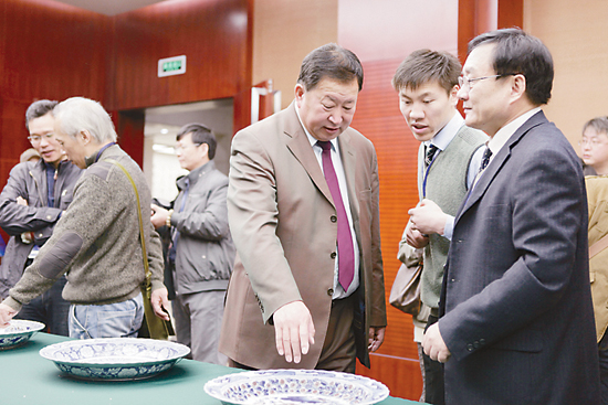 在國際元青花學(xué)術(shù)會議上,伊朗國家博物館專家(上圖)、蒙古國家博物館館長(下圖)觀摩元青花展品。