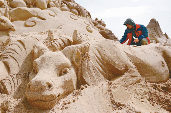 山東省文登市南海新區為促進旅游經濟發展,在海濱沙灘打造了全長2500米、共107座沙雕組成的沙雕群,成為目前我國海岸線上最長的沙雕群。據悉,該沙雕群將于“五一”前夕對游客開放。圖為4月23日工作人員在制作沙雕。
