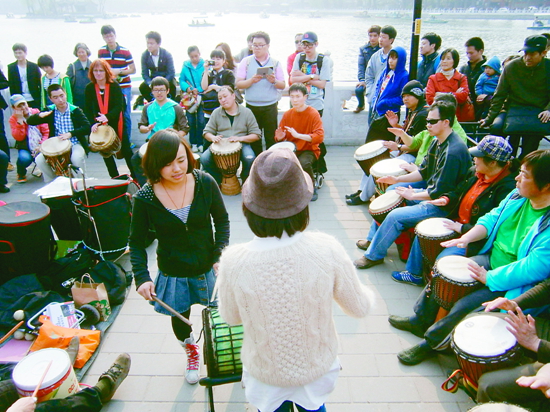 這種來自非洲的原始樂器,在一系列中外樂器中幾乎排不上名次,甚至在各個正規的音樂劇場難登大雅之堂,卻從非洲本土發展到美洲,又從異國引進中國,跨地域跨文化跨種族,像一朵小花在中國民間滋生旺盛成為氣候,吸引不少年輕人學習操作,它的魅力何在?參加“鼓聚”的鼓者說:學習非洲鼓門檻低,演奏方式容易掌握,幾乎每個人都可以參與。不同職業不同年齡性別的人坐在一起打鼓,大家在鼓聲中尋求統一的節奏,找到聲音的共鳴。非洲鼓打起來那種震撼魂魄的激情,會讓我們這些在文明中浸染太久的東方人,有一種自然的渴望和沖動。一位年輕女教師說:“我很小的時候學過電子琴,后來就沒時間練琴了。但自從每個周日來后海參加‘鼓聚’,我的興致和積極性很高。打鼓的時候會很專注,注意力集中,人的情緒通過復雜的節奏得到釋放宣泄,身心在鼓聲中減壓。所以忙碌了一個星期,很期盼周末來這里享受‘鼓聚’。”一個外號“笨鳥”的中年男人是鼓聚的“老人”,每次“鼓聚”,他打得最盡興。但他的鼓不是正宗非洲鼓,而是鐵皮的化工油漆桶。旁人看著有點搞笑,但他說,鼓打到一定境界,盡興的已經不是手下打的是什么鼓,而是你全身心體會和沉浸于擊打的過程。