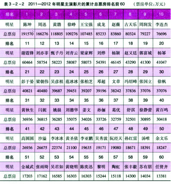 表中的數據顯示,2011-2012年最具票房號召力的男星前10名依次為:陳坤、黃渤、徐崢、王寶強、成龍、古天樂、周潤發、李連杰、謝霆鋒、甄子丹;最具票房號召力的女星前10名依次為:周迅、趙薇、劉亦菲、楊穎(Angelababy)、楊冪、范冰冰、張柏芝、徐帆、閆妮、姚晨。男星的票房號召力相對來說比較平衡,女星則相差懸殊。男星排名第一的陳坤憑借《畫皮Ⅱ》《龍門飛甲》等影片吸引近20億的票房,隨后的黃渤、徐崢和王寶強僅憑一部票房冠軍《人再囧途之泰囧》即有超過10億的票房入賬,其他片子只添零頭。第10名甄子丹也吸引了近6億的票房收入。而女星的冠亞軍票房的大部分來源都是《畫皮Ⅱ》。周迅另有《聽風者》《大魔術師》和《龍門飛甲》,將超過16億票房歸入名下,排在隨后的趙薇除《畫皮Ⅱ》之外,還有一部《愛》,使她的票房號召力擴大到超過8億。而排在第10名的姚晨僅有約3.6億的票房收入。上表中的統計方式或許不夠科學,但數據是基本準確的,可以作為制片決策中的一個參考。