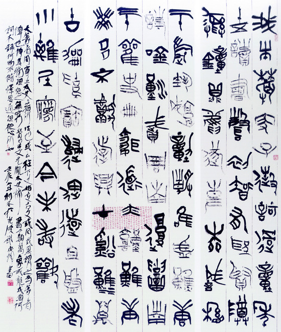 “這些作品有明確的取法和傳承,既有傳統(tǒng)的甲骨、大篆、小篆等,也有簡(jiǎn)帛書等書體風(fēng)格;既注意把握古文字的規(guī)律,又注重藝術(shù)化個(gè)性的表現(xiàn),特別注重筆墨技巧的大膽探索和個(gè)性風(fēng)格的適度張揚(yáng),可謂精品琳瑯、佳作紛呈,基本反映了當(dāng)代篆書藝術(shù)繁榮發(fā)展的局面。”言恭達(dá)說。2012年,中國(guó)書協(xié)篆書專業(yè)委員會(huì)在山西大同舉行了工作會(huì)議,確定了“引領(lǐng)、提升、服務(wù)、積累”的工作方針:引領(lǐng)當(dāng)下審美導(dǎo)向,提升創(chuàng)作者的文化內(nèi)涵,服務(wù)當(dāng)下書法主流文化和大眾生活,積累創(chuàng)作者的文化素養(yǎng)。商周秦漢變化萬(wàn)千、豐富多彩的篆書,乾嘉中興后名家林立、各具風(fēng)姿的篆書,在當(dāng)代,形成了藝術(shù)變化多、個(gè)人風(fēng)貌多的創(chuàng)作趨向。