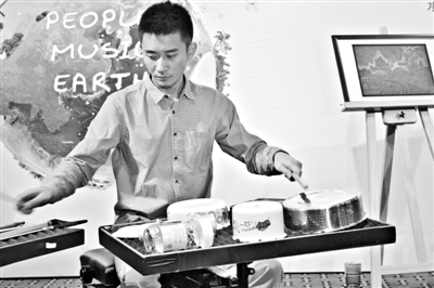 “人類·音樂·家園”2013世界環境日主題音樂會新聞發布會現場,樂手演示如何用“垃圾”演奏音樂。