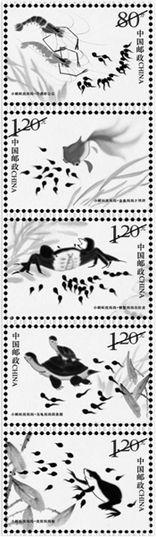 中國動畫藝術史上第一部水墨動畫《小蝌蚪找媽媽》,1961年由上海美術電影制片廠出品,講述了一群小蝌蚪尋找媽媽的具有科普意味的故事。據(jù)此改編的郵票,描繪了“巧遇蝦公公”、“金魚媽媽大眼睛”、“螃蟹媽媽白肚皮”、“烏龜媽媽四條腿”、“找到媽媽啦”五個故事情節(jié)。全套郵票5枚,郵票全套價值5.6元,同時發(fā)行郵票小本票。