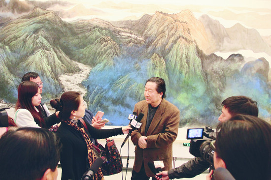 中國國家畫院院長楊曉陽在畫展現場接受媒體采訪