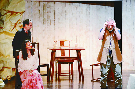 《鐵軌之舞》的演出在烏鎮(zhèn)西柵的國樂劇院。這座傳統(tǒng)劇院建在水上,可推窗望河。舞臺上的屋頂在修葺一新后,更顯金碧輝煌、古意盎然。在這樣的演出空間內(nèi),《鐵軌之舞》現(xiàn)代、簡約風(fēng)格的舞美與充滿厚重感的故事既凸顯出歷史的滄桑,也交織出人物心理結(jié)構(gòu)的復(fù)雜多向。同在這座劇院上演的羅伯特·布魯斯汀的《最后的遺囑》也是一段歷史故事:莎士比亞在臨終前確立遺囑,將大部分遺產(chǎn)留給他的大女兒,僅給他的妻子“我第二好的床”。戲劇巨匠在人生最后時刻經(jīng)歷了精神的狂亂,又在癲狂中希求最后的愛與溫暖。國樂劇院別具古典東方的舞臺演繹著英國人的故事,有1300年建鎮(zhèn)史的烏鎮(zhèn)映襯著莎士比亞時代的古老,巨大的中西差異卻因相似的歷史感而消弭。羅伯特·布魯斯汀集編劇、導(dǎo)演及戲劇教育家于一身,被譽為“當(dāng)代劇場的傳奇人物”。《最后的遺囑》結(jié)合藝術(shù)與生活,更以濃縮的手法全景式再現(xiàn)了莎士比亞的創(chuàng)作生涯,并精妙地將莎士比亞與他筆下的人物進行對照——當(dāng)他病入膏肓、將自己的二女兒喚作《李爾王》中的“考狄利婭”時,觀眾感受到的是多個文本疊加后產(chǎn)生的情感沖擊。