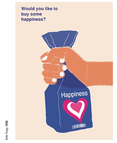 而設計師孫彤的插畫是一只手握著一個標有“幸福”的購物袋,旁白是“你想要買些幸福嗎?”這和當天的沙龍主題非常契合。