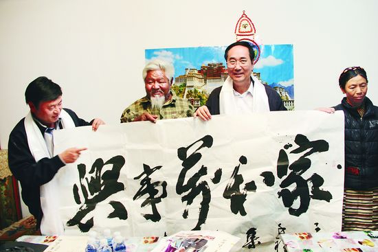 這一邊,演員們傾情演出;另一邊,書畫家們則擺好筆墨,為當(dāng)?shù)厝罕妱?chuàng)作起了書畫作品。張亮京、李呈修、王利軍、吳進(jìn)良、顏振卿、譚軍立、邢光輝7位來自北京的書畫家在露天擺放的不大的書桌上揮毫潑墨,一幅幅遒勁有力的書法,一張張韻味十足的畫作,讓現(xiàn)場翰墨飄香,吸引了眾多群眾駐足觀看。譚軍立還與藏族書法家南杰旺扎合作了一把,兩人在同一張紙上寫下漢字、藏文兩個(gè)“福”,譚軍立說,這次來拉薩就是想把美好的祝愿送給藏族同胞,希望他們的生活越來越幸福,福字代表了首都藝術(shù)工作者的祝愿。畫家吳進(jìn)良則畫了一幅雄雞牡丹圖,他邊畫邊向記者講述這幅畫的美好寓意:“雞,吉也,代表著吉祥,牡丹則意為富貴,想祝福藏族人民吉祥如意。”在近兩個(gè)小時(shí)的書畫交流中,北京和拉薩的書畫家們完成了數(shù)十篇書畫作品,并把這些作品送給了藏族群眾。就連在現(xiàn)場執(zhí)勤的民警也經(jīng)不住誘惑,向書畫家們求起了字畫。