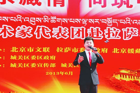 清晨我站在青青的牧場,看到神鷹披著那霞光,像一片祥云飛過藍(lán)天,為藏家兒女帶來吉祥……”當(dāng)歌手高鵬飛唱著藏族群眾熟悉和喜愛的歌曲《天路》走下舞臺(tái),演出現(xiàn)場一片沸騰,合唱聲、拍掌聲一浪高過一浪,而高鵬飛脖子上潔白的哈達(dá)也堆成了一座小小的“雪山”。這是近日發(fā)生在西藏堆龍德慶縣羊達(dá)鄉(xiāng)通嘎村的一幕。6月19日至28日,由北京市文聯(lián)組織的首都藝術(shù)家一行近60人來到西藏拉薩,為當(dāng)?shù)剞r(nóng)民、市民、援藏工人、駐藏部隊(duì)官兵送去了5場慰問演出,其間還舉辦了4場書畫筆會(huì),所到之處受到熱烈歡迎。