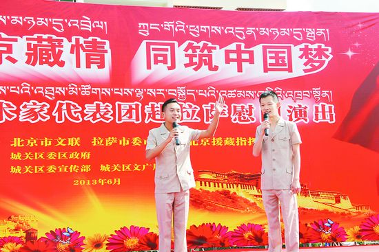 6月21日上午,藝術(shù)家們又來到城關(guān)區(qū)納金鄉(xiāng)塔瑪村演出,豐富多彩的節(jié)目深深吸引了當(dāng)?shù)厝罕姟Q莩鼋Y(jié)束后,首都的藝術(shù)家們還在北京市文聯(lián)黨組書記、常務(wù)副主席陳啟剛的帶領(lǐng)下走進(jìn)了該村貧困家庭丹增家中進(jìn)行慰問。陳啟剛代表首都藝術(shù)家向70多歲的老人一家送上了慰問品和慰問金,以及書法家顏振卿創(chuàng)作的一幅“家和萬事興”書法作品,祝愿他們的日子越來越好。下午,藝術(shù)家們又馬不停蹄地趕往北京援藏項(xiàng)目拉薩市文體中心工地進(jìn)行慰問演出,在暴曬的露天工地現(xiàn)場,藝術(shù)家們?yōu)楣と藗儷I(xiàn)上多個(gè)飽含著家鄉(xiāng)人民深情的節(jié)目,現(xiàn)場一片歡聲笑語。由于媒體的報(bào)道,活動(dòng)在當(dāng)?shù)匾饛?qiáng)烈反響, 6月22日,首都藝術(shù)家代表團(tuán)應(yīng)邀在拉薩警備區(qū)某部為官兵們額外增加了一場演出和一場書畫筆會(huì),深受部隊(duì)官兵好評。而本次活動(dòng)的最后一場演出,也是本次活動(dòng)的重頭戲——在拉薩市政府會(huì)議中心舉行的“共話京藏情 同筑中國夢——首都藝術(shù)家赴拉薩慰問演出”,共吸引了拉薩市黨政軍及各界群眾、學(xué)生600余人前來觀看,演出現(xiàn)場,藝術(shù)家們賣力演出,觀眾熱情鼓掌叫好,京藏兩地的濃濃情誼盡在不言中。拉薩市第二高級中學(xué)的高一學(xué)生巴措,特地早早完成功課后趕來了,她告訴記者,以前看這種演出的機(jī)會(huì)不多,因此特別高興,“我最喜歡舞蹈和魔術(shù)了,舞蹈很美,魔術(shù)太神奇了!其他的節(jié)目也很棒,回去后我要把我用手機(jī)錄的視頻放給同學(xué)看。”一臉得意的巴措是班里的文藝委員,她是帶著“學(xué)習(xí)”的任務(wù)前來的。