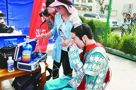 臺(tái)上表演舞蹈《秦王點(diǎn)兵》的幾個(gè)小伙子賣力演出,一下臺(tái)他們就因嚴(yán)重缺氧吸起了氧氣 梅 雁 王春梅 攝