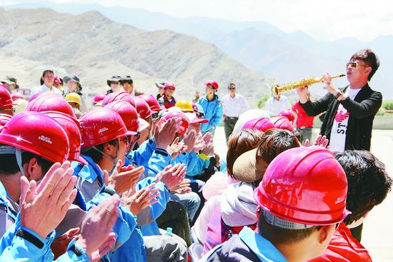 而在城關(guān)區(qū)納金鄉(xiāng)塔瑪村,青年演奏家姜旭從臺(tái)上走到藏族村民中間,分別用五六種民族管樂樂器演奏了《唱支山歌給黨聽》《十月是你的生日》《北京的金山上》等歌曲,動(dòng)聽的旋律感染著觀眾,引得藏族群眾紛紛為他獻(xiàn)上哈達(dá)。演出時(shí)還意氣風(fēng)發(fā)的他一結(jié)束演出,就趕忙走到吸氧處大口大口吸起了氧氣,“吹奏樂器要消耗很多氣力,雖然演出時(shí)有點(diǎn)缺氧不太舒服,但是幸好演出沒受影響。”此次是姜旭第一次來西藏,為了能夠成行,他推了好幾場商業(yè)演出,姜旭告訴記者,看到觀眾們那么熱情,他很感動(dòng),也很受鼓舞,“這是真正的為人民服務(wù),很接地氣,以后有機(jī)會(huì)我還來!”在拉薩市文體中心工地,露天的演出場地,毒辣的日頭曬得人頭昏眼花,演員們卻冒著高溫流著汗水奉獻(xiàn)著高質(zhì)量的演出。口技演員方浩然來到工人中間,惟妙惟肖地模仿起鳥、藏獒、獅子、羊、驢等十多種動(dòng)物的叫聲,逗得大家哈哈大笑。方浩然在上場前特意吸了很長時(shí)間的氧氣,為的是保證演出質(zhì)量。他告訴記者,來西藏之前他還一直擔(dān)心這次能不能在高原上完成演出任務(wù),來了以后雖然有些高原反應(yīng),但基本還算適應(yīng)。“與觀眾互動(dòng)時(shí),看到大家熱烈的反應(yīng),再苦也值得!”