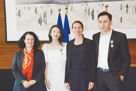 6月27日,在法國駐華大使館大使官邸,法國文化部長奧蕾麗·費利佩蒂為中國演員章子怡、劉燁頒發(fā)了法國藝術(shù)與文學(xué)騎士勛章。