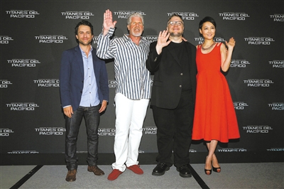 主演查理·戴、朗·普爾曼、導演德爾·托羅和女主演菊地凜子(左起)出席了《環太平洋》首映。