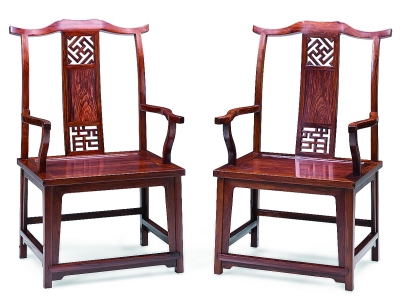 整件家具選用一棵樹的材料制作,這種“一木一器”的選料方式是傳統家具用材的最高標準。這套官帽椅造型方正素雅、線條流暢優美、紋理潤澤瑰麗,將明式家具簡潔優雅的美感呈現無遺。尤其是其榫卯制作工藝,采取了全榫卯可拆裝方式,無需使用膠粘或加楔釘一類的加固手法,完全靠榫卯間的榫接卯合成器,鉚合處連一根頭發都插不進去,非常緊密牢固。據了解,與普通榫卯非全拆裝家具相比,工藝高超的全榫卯拆裝黃花梨家具獨具收藏價值。從“型、藝、材、韻”四個紅木家具品鑒準則可以看出,工藝的高低也是判斷紅木家具等級和價值的重要標準。全拆裝家具制作需要木工有豐富的經驗、心靈手巧并且有過硬的技術實力,在工廠化生產制作的行業背景下,家具制作越來越借助機械來加工完成,能夠掌握這種傳統工藝水準的工匠并不多。因此這類制作耗時費力、選料精良,使得全拆裝紅木家具在市場上很少見,要想收藏一件全拆裝的紅木家具,可以說是可遇不可求的。