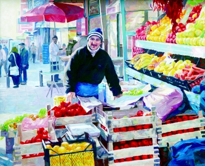 回國后,我根據收集的素材創作了一批反映土耳其風情的繪畫作品,并參加了由中國文化部和土耳其駐華使館共同舉辦的“神秘土耳其”畫展。畫展中的一幅《街頭市場》描繪了伊斯坦布爾海邊市場的生動情景和快樂熱情的商販,從一個側面展現了土耳其人民的幸福生活。土耳其駐華大使穆拉特·薩利姆·埃森利在欣賞這幅畫時,稱贊這幅畫十分真實生動,說自己甚至可以從畫中認出這個商販來自土耳其的哪個地區。大使夫人十分喜歡并私人收藏了這幅畫。