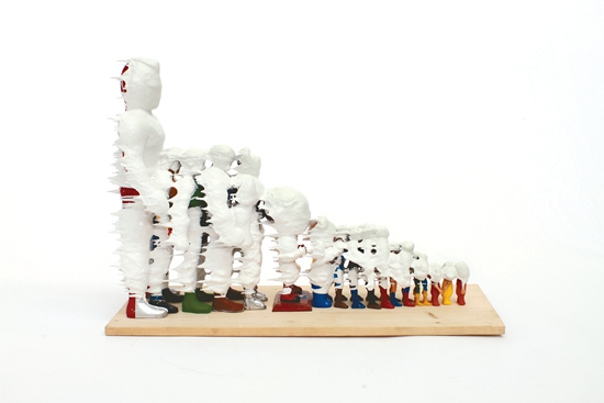 尤倫斯當代藝術中心(UCCA)于近日舉辦展覽“金氏徹平:卓之物”,綜合呈現了日本藝術家金氏徹平于2012年夏季在UCCA駐留期間特別創作的一系列裝置、拼貼和錄像作品。在《卓之物》中,金氏徹平大量使用日常商品,如呼啦圈、購物車、塑料恐龍、人形玩偶、馬克筆……并把它們安插在雕塑裝置及紙板拼貼作品中,盡管這些現成品“素材”自身已非常完整——并具有一定的象征意義,他卻能夠利用它們經過重新組織再創造成弗蘭肯斯坦式的新形式。藝術家將白色樹脂燒融澆筑在“雜物堆”上,樹脂向下流淌甚至完全覆蓋了某些物品,逐漸降溫變硬、并且匯聚于基底,使得雕塑裝置中各個物品的單獨意義變得更加模糊。
