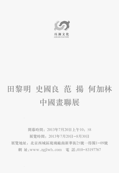 2013年7月20日,“禪境明心 泛游山林——田黎明、史國良、范揚、何加林中國畫聯(lián)展”在北京琉璃廠玨瀾畫廊開幕。展出田黎明、史國良、范揚、何加林中國畫精品50余幅,涵括人物、山水、花鳥,充分顯現(xiàn)出他們精湛的藝術(shù)水準和個性面貌。