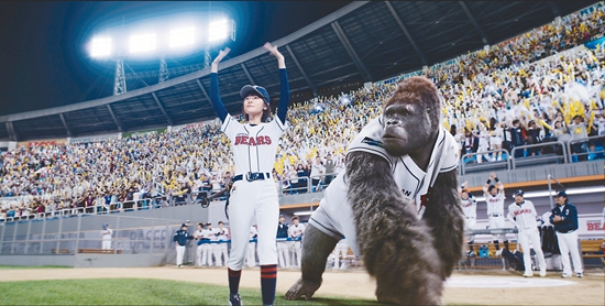 作為一部主打3D和動作捕捉技術(shù)的體育片而言,《大明猩》的視覺形式無疑是可圈可點的,至少在亞洲電影范圍內(nèi)。大猩猩MR.GO會打棒球這一點是全片最大的賣點,雖然全片未能在3D效果方面有一個持續(xù)的表現(xiàn),但大猩猩的每一次擊球都讓3D與觀眾心理產(chǎn)生了極好的互動。在轉(zhuǎn)制3D片大行其道的當下,《大明猩》提供了一定程度上的視覺奇觀。同時,通過動作捕捉技術(shù)而出現(xiàn)在銀幕上的大猩猩幾乎可以媲美《猩球崛起》中的猩猩以及《少年派的奇幻漂流》中的老虎。