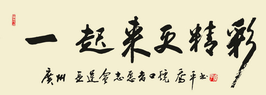 “一起來,更精彩。”這句話,作為2010年廣州亞運會志愿者口號,影響甚廣;在亞運會舉辦的前前后后,也以書法的藝術(shù)形式在廣州市的大街小巷、在亞運會的比賽場館、在亞運村的各個房間、在志愿者的穿戴服飾上流傳。那首譚晶演唱的亞運會主題歌《一起來,更精彩》,從頭至尾,畫面上始終流動著這幅書法作品,就連譚晶的衣服上也印著。該作品為紙本,4尺橫幅,現(xiàn)收藏在廣州亞運會博物館。