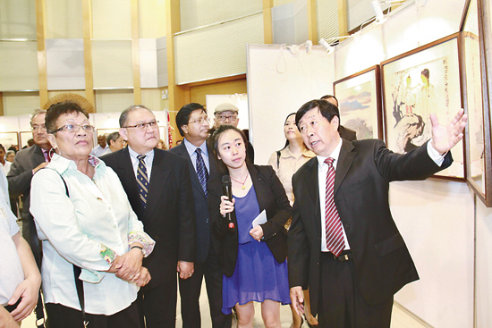 “要想世界人民能欣賞并喜歡中國水墨畫,首先要讓他們了解水墨畫,并有計劃地將當代高水平的水墨畫作品推向世界,在國際有重要影響力的展覽上展示水墨畫。”劉大為說。在這樣的理念指引下,中國美協5年來積極開展廣泛的國際美術交流,并逐漸形成涉外品牌項目“中國美術世界行”,迄今為止已在8個國家的20余座城市舉辦了中國美術作品展,足跡橫跨歐亞非大陸。在實施過程中,中國美協與世界各國主動建立并始終保持著長期友好的合作關系,法國、德國、奧地利、瑞士、意大利、葡萄牙、科特迪瓦等國都曾與中國美協共同舉辦美術展覽。開幕式結束后,李立大使、劉大為陪同毛里求斯嘉賓逐一欣賞佳作,當地媒體給予展覽高度關注。