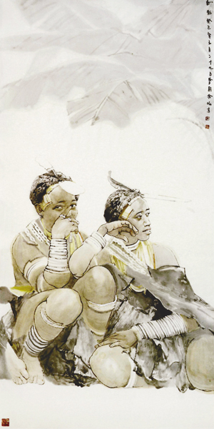 時至今日,中國畫的表現題材早已邁出國境,競相呈現異域的風土人情。作品汲取傳統沒骨畫法,輔之西畫光影層次之所長,精心刻畫了非洲女性獨具特征的五官,造型結構嚴謹,線條變化豐富,色彩淡雅明快,將人物的雙眸注入了東方美學的神韻,令人回味。