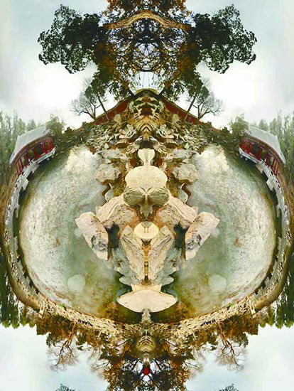 展覽中李戈的攝影作品充滿著樹(shù)的靈性,他說(shuō):“我去散步時(shí)到了孔廟,無(wú)意中發(fā)現(xiàn)了一棵樹(shù),他使我聯(lián)想到孔子及古代的人。孔廟里的樹(shù)都有著上百年的歷史,仔細(xì)觀察的話你會(huì)發(fā)現(xiàn)那些樹(shù)的樹(shù)癤子有的像人的眼睛,有的像鼻子,都很有神秘感。于是我對(duì)同一位置的景物進(jìn)行明暗對(duì)比的拍攝,然后將圖片對(duì)接合成,結(jié)果就如同大家所看到的這些作品:天空很藍(lán),葉子是綠色的,對(duì)比效果被削弱了,在黑色的陰影里依舊可以看到清晰的細(xì)節(jié)。”對(duì)于自己的作品,李戈說(shuō)其中有一部分是他在拍攝時(shí)就已經(jīng)知道了自己想要的效果,另一些則是他在大量地隨機(jī)拍攝后到電腦制作時(shí)又偶然間產(chǎn)生的新發(fā)現(xiàn)、新構(gòu)想。