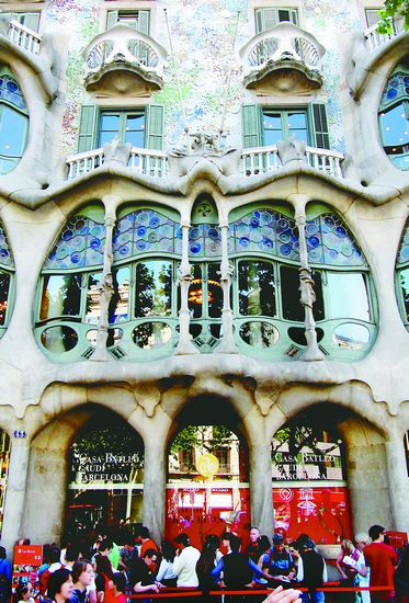 高迪最為美妙的創作是巴特婁之家。這是一件有著極具殺傷力的美麗外表且復雜的精美之作。它的骨骼柱列為波浪形的窗戶鑲邊,其功用遠不限于連接房子與街道。從它的身邊經過,你會感到像是進入另外一個王國。用一個恰如其分的譬喻,它就像是一幕瓦格納歌劇的序曲,因為它像極了瓦格納式張揚的表演風格,巴特婁之家是一件徹頭徹尾的、會吸引你全部注意力的藝術作品。那華麗宏偉的正面外觀引領觀者進入另一個現實,它的內部足以喚醒驚奇之感。深沉的色彩、令人印象深刻的有機空間、蜿蜒的木質雕刻裝飾帶你從一個房間走到另一個房間,仿佛漫游在一座海底宮殿中。