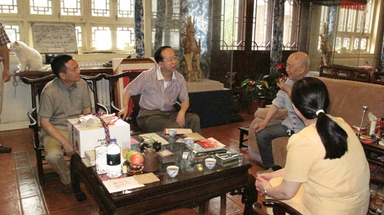 8月15日,北京遠郊萬荷堂格外熱鬧。主人黃永玉將在這里迎來自己的90華誕。雖然距離晚上的大party還有一段時間,但上午來賀壽的客人已經絡繹不絕。中國文聯黨組成員、副主席左中一一行,一早便帶著中國文聯黨組書記、副主席趙實親筆寫的生日賀卡和蛋糕、鮮花專門趕來看望黃永玉。