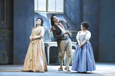 昨晚,國家大劇院制作的莫扎特歌劇《費加羅的婚禮》首演。歌唱家沈洋(中)、黃英(右)領銜的中國版演員演繹了這部歌劇。此版由西班牙導演何塞·路易斯·卡斯特羅執導。紐約大都會歌劇院簽約的80后歌唱家沈洋首次在大劇院舞臺上挑梁演出,以飽滿的嗓音詮釋了機智的費加羅。花腔女高音黃英扮演的費加羅未婚妻蘇珊娜,則以精致的唱腔與活潑的表演與高大、滑稽的費加羅相映成趣。