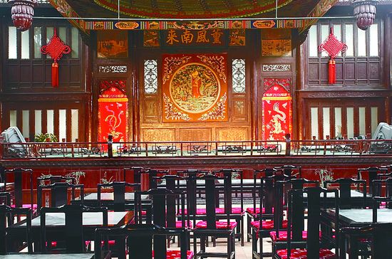明清兩朝由于帝王對戲曲的濃厚興趣,宮廷演劇達到鼎盛。而宮廷戲臺源自于宮廷演劇,目前所能見到的宮廷戲臺多為清宮遺存。清宮戲臺根據(jù)形制和規(guī)模,又可分為室內(nèi)小戲臺、中型戲臺和院落式三層大戲樓。如北京故宮暢音閣大戲樓、北京頤和園德和園大戲樓等。宮廷戲臺的建設(shè)云集了當時的能工巧匠,繼承了歷代戲臺建筑的先進經(jīng)驗,彰顯富麗堂皇、華麗精致的皇家氣派。而與之相對應的私家戲臺的建設(shè)則與我國的堂會演劇密不可分。這些戲臺依主人的興趣和愛好而建,格局多樣,表現(xiàn)出較大的隨意性,選建地點有的在門廳室內(nèi)或庭院府第之中,有的與園囿池地連成一體,有的則置于船舫之中。如北京恭王府室內(nèi)戲臺、江蘇揚州何園寄嘯山莊戲臺等。