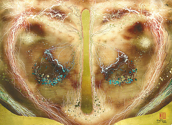 這幅畫是對視網(wǎng)膜分層結(jié)構(gòu)的一種水墨描繪。畫的上方是感光體,下方是神經(jīng)節(jié)細胞,光信息經(jīng)過這兩處之后,被傳到丘腦和視覺皮層,進行更進一步的解讀。