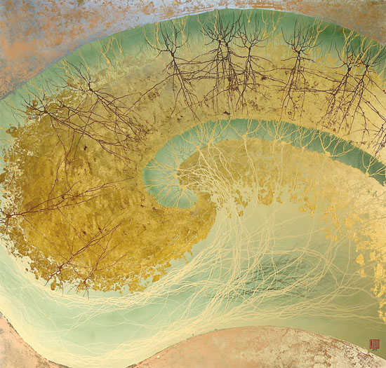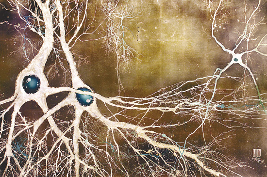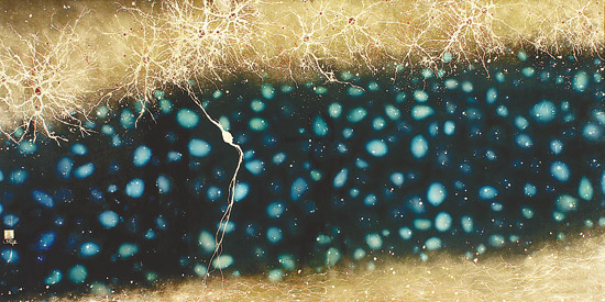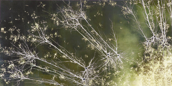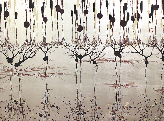 鄧恩在顯微鏡下看到的一切,讓他想起了整潔優(yōu)雅的竹制卷軸畫和一些其他形式的亞洲藝術(shù),于是他開始用一種類似的形式來畫神經(jīng)細胞。他結(jié)合自己發(fā)展出來的技法對傳統(tǒng)水墨畫進行了補充,比如把墨水滴吹到介質(zhì)表面上,墨水滴的擴散方式像極了神經(jīng)元的生長形態(tài)。鄧恩說道,由自然力量推動,但在遇到微觀障礙時,會隨機形成分支越過障礙。“我喜歡以類似的力量來畫畫,并形成一種藝術(shù)”,他說。