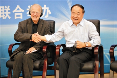 莫言與德國詩人福爾克爾·布勞恩(volker Barun)參與交流會。新京報記者 秦斌 攝