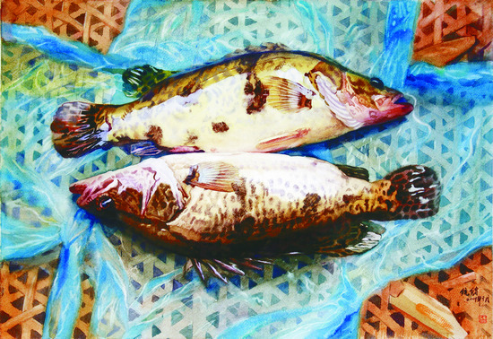 白統緒的《鱖魚》(水彩)作品在湖北美術館展出
