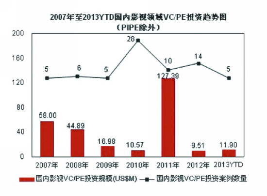 2007年至2013YTD國內(nèi)影視領(lǐng)域VC/PE投資趨勢(shì)圖(PIPE除外) 圖片來源:CVResearch投中研究院