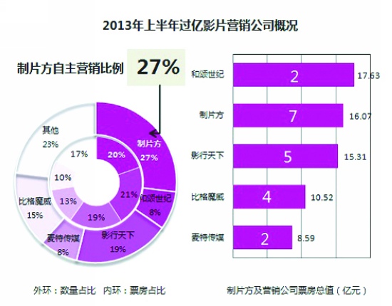 據(jù)藝恩咨詢統(tǒng)計(jì),今年上半年票房過億的26部影片中,有17部影片選擇第三方電影營銷公司參與營銷,比例高達(dá)66%。國內(nèi)的電影營銷公司也紛紛“浮出水面”,從幕后走到臺(tái)前,成為電影產(chǎn)業(yè)鏈上醒目的一環(huán)。難怪迅雷網(wǎng)絡(luò)副總裁金暉感嘆,電影營銷的黃金時(shí)代正在來臨。