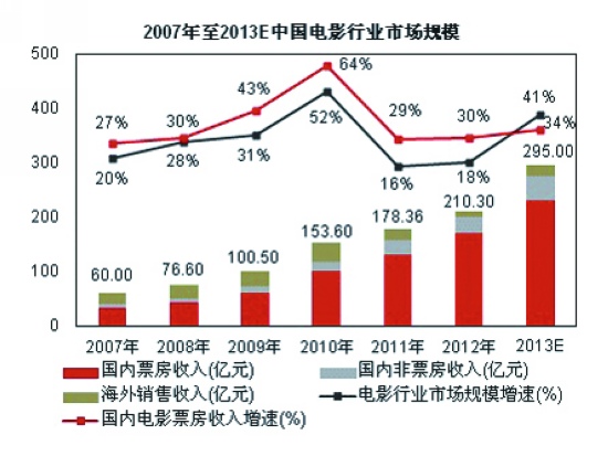 2007年至2013E中國電影行業(yè)市場規(guī)模 圖片來源:CVResearch投中研究院