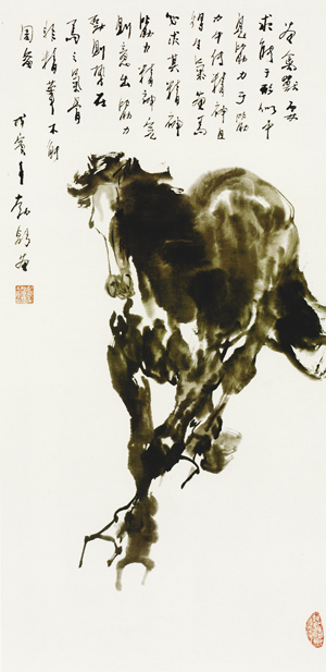 他的脾氣又“上來了”,他畫低頭喝水的馬,畫馬屁股,盡管超越公眾視覺的慣性,盡管不為市場所喜。“要說我和徐先生的不同,我必須想辦法開拓,要不愧為他最后一個弟子;第二個,時代不同,認識不同,我的馬的形態自然不同。”