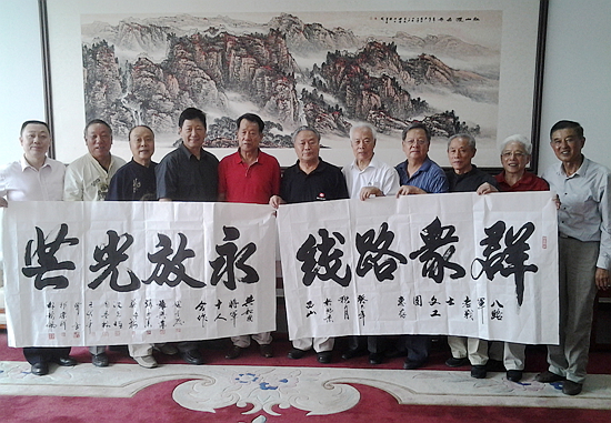 焦歌團長及共和國十位高級將領與書法巨作《群眾路線永放光芒》合影留念