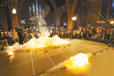 昨日記者現(xiàn)場看到,蔡國強先開始作畫,并鋪好火藥。下午5點半,在一切準備就緒后,蔡國強開始點火。在短短的7秒左右,巨大的爆破聲中濃煙彌漫新天安堂,7.44米×2.42米的火藥畫《故鄉(xiāng)》也隨之完成。