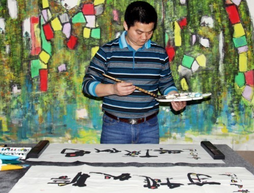 談起彩書創作,柏俊說自己是行走在創意與傳承之間,兩者充滿矛盾。要創新,就必須打破原有格局,尋找出新的“和而不同”的平衡點。他強調彩書創作充滿三個元素:一是墨色混搭;二是不規則方塊組合;三是略帶卡通元素的造型,圍繞三元素進行的創新使柏俊的彩書作品,神情各異、妙趣天成、不重復自己,不重復古人,即便同樣一個字,隨性組合,創作多種寫法。家鄉名賢、著名的藝術先驅林鳳眠大師那“融合中西”的藝術成就,就為柏俊創意“彩書”藝術提供了可資借鑒,也堅定了柏俊“彩書”創作的信心和決心。吳冠中、趙無極、周德群、黃永玉等一個個讓他頂禮膜拜的藝術泰斗,同樣柏俊找到了自己堅定的藝術信念。