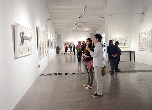 展覽現場嘉賓觀看畫作 中國文藝網 黃遠 攝