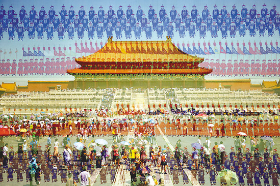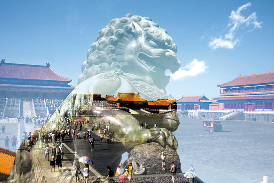 《尚書》有句云“經(jīng)天緯地曰文,照臨四方曰明”,文明一詞已有界定。《說文解字》有釋曰“文,錯畫也,象交文”。建川多用中、大畫幅膠片疊印積累的影像,營造出交錯幻生的畫面,是謂文也。“化”意為變易,衍生,改造,即“萬物化生”。《京城記憶》不是單純的寫生觀照,特殊的技術(shù)方法是觀念意象的語言保障,文明與文化的圖像解釋。
